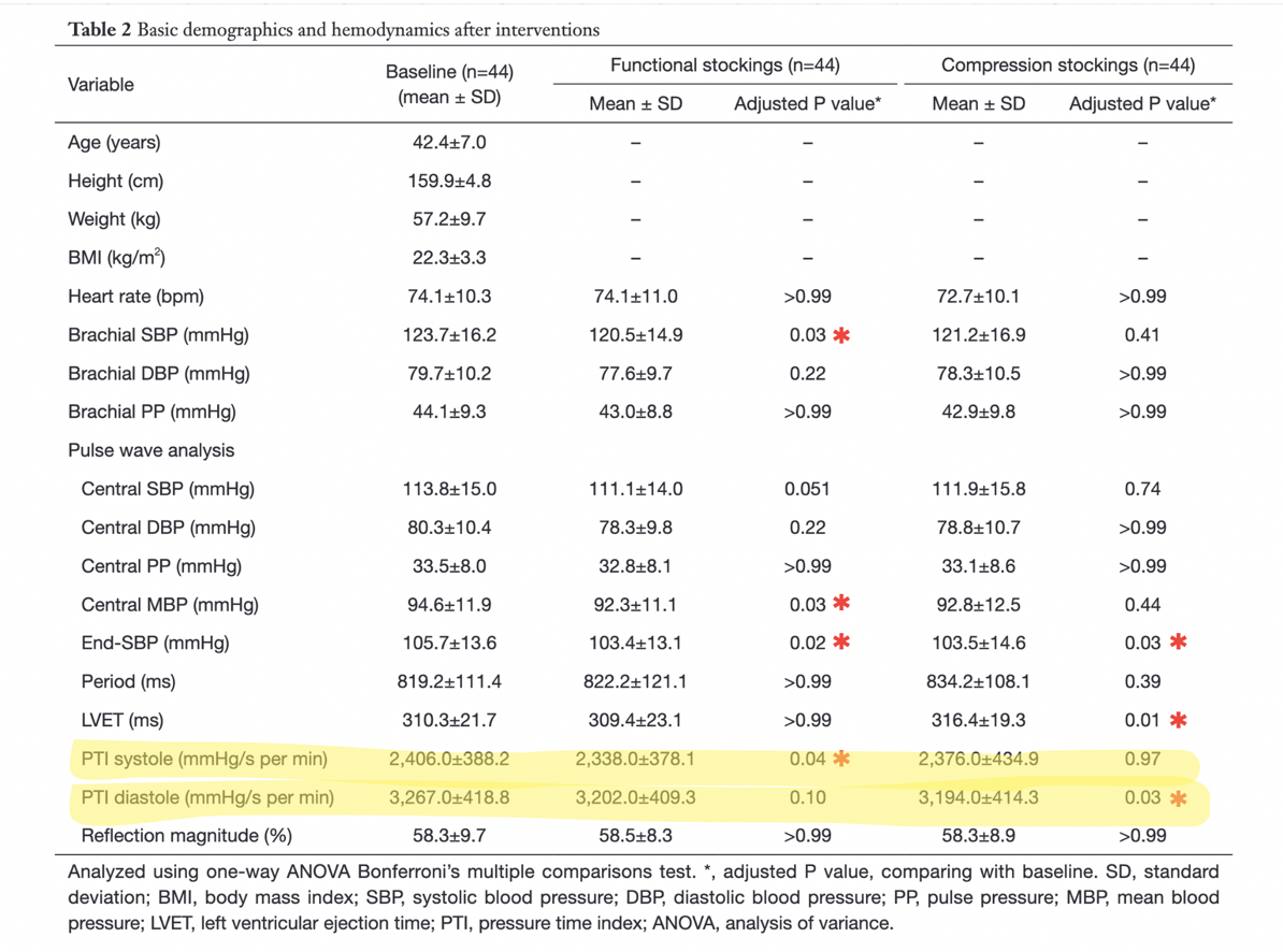 手臂收縮壓 (Brachial SBP):下降(123.7 → 120.5 mmHg, P=0.03)👉 意思:收縮壓有小幅度降低。中心平均血壓 (Central MBP):下降(94.6 → 92.3 mmHg, P=0.03)👉 意思:心臟中心區域的平均血壓也下降。